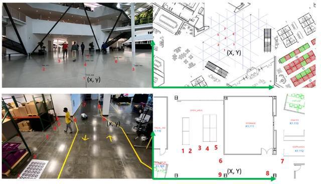 圖 2 提供了兩個演示該過程的示例,考慮到任務是找到左側攝像頭像素與右側平面圖之間的映射關系,唯一需要的是一系列可同時位于左右兩側的地標 {1, 2, 3, 4, ...}。選定一系列地標后,攝像頭位置(x, y)和世界位置(X, Y)會以相應的像素坐標形式給出,然后就可以通過現有的庫,輕松計算出同構矩陣(例如 OpenCV)。