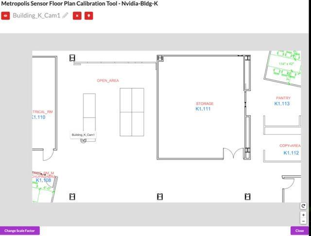 通過攝像頭校準,NVIDIA Metropolis 參考應用可以在提供的平面圖上定位檢測到的物體,并建立多個攝像頭之間的物體位置空間關聯。這是在智能視頻分析領域,構建大規模實時位置服務和其他有意義的服務,所必不可少的一個步驟。