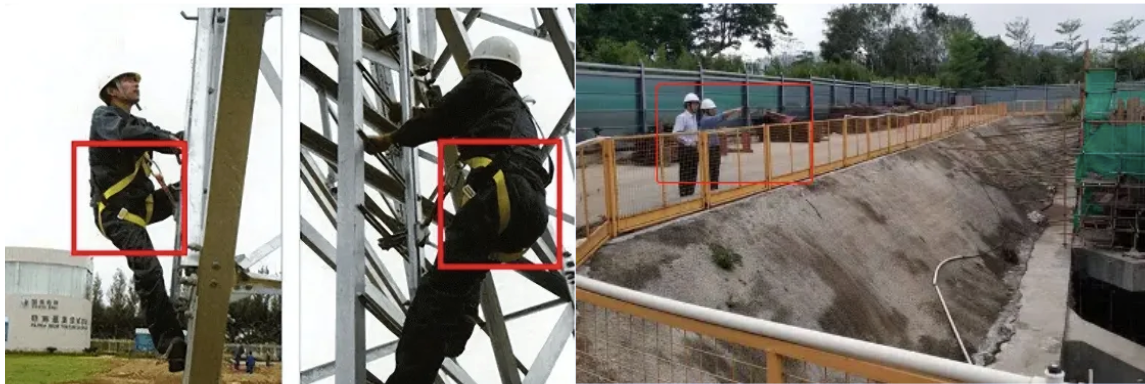 安全繩/安全帶識別:通過目標檢測獲取工作人員的位置信息,裁剪出人體圖像區域,再通過人體表面關鍵特征目標檢測(肩部、腰部錨安全繩/安全帶)判斷安全繩系掛狀態,識別是否為“未系掛”違規行為。臨邊洞口防護識別:通過目標識別獲取工地現場地面上的洞口區域,裁剪出洞口及周邊區域,通過識別判斷洞口附近是否存在防護欄桿,再采用U-Net++分割模型分割得到洞口與防護蓋板的面積,計算出洞口防護覆蓋率。