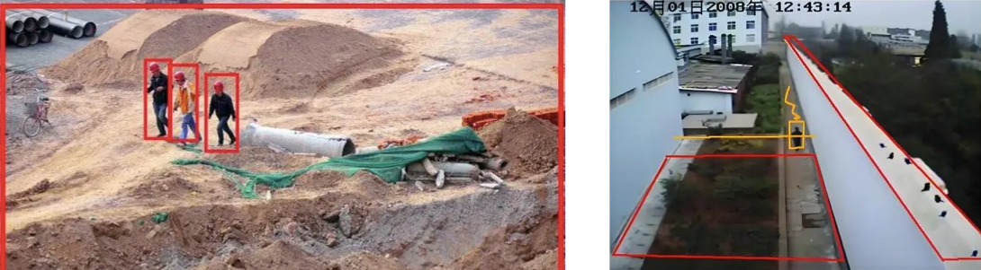 可基于AI視頻智能分析技術實現。通過在監控攝像頭中設定警戒區域,實時監測人員或物體的異常行為,如翻越圍墻、靠近未防護的邊緣或洞口等,并及時發出警報。同時,系統可與安全防護設施聯動,如自動觸發安全網或防護欄的警示裝置,確保工人遠離危險區域。